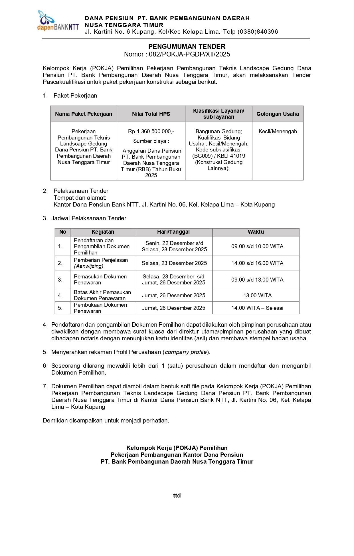 PENGUMUMAN TENDER PEKERJAAN PEMBANGUNAN TEKNIS LANDSCAPE GDUNG DANA PENSIUN PT. BANK PEMBANGUNAN DAE...